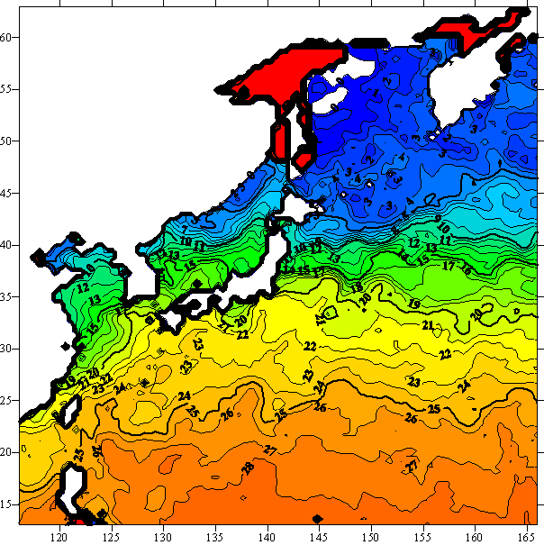 o 2005년 1월 1일 북서태평양 광역해양 수온분포 입니다.
