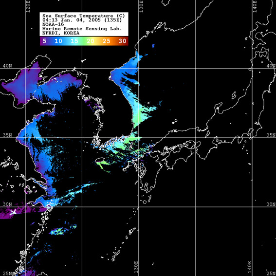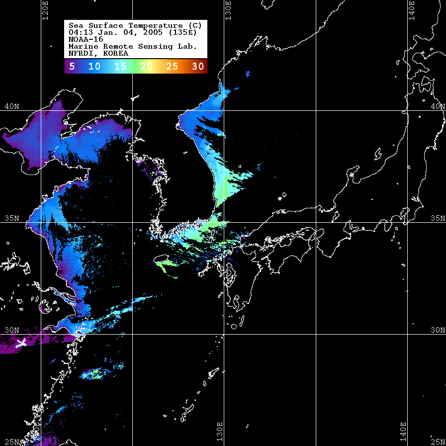 o 2005년 01월 04일 04시 13분 NOAA-16호 위성영상입니다. o 수온분포는 범례를 참고하시기 바랍니다. o 검은색은 구름 또는 육지를 나타냅니다.