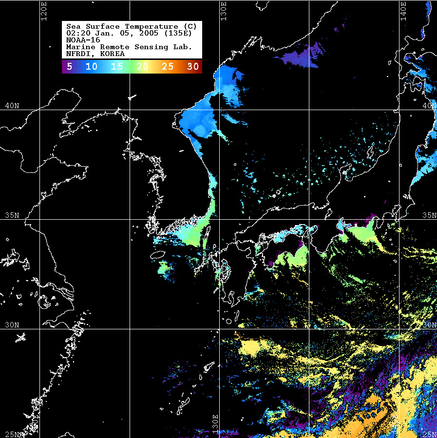 o 2005년 01월 05일 02시 20분 NOAA-16호 위성영상입니다. o 수온분포는 범례를 참고하시기 바랍니다. o 검은색은 구름 또는 육지를 나타냅니다.