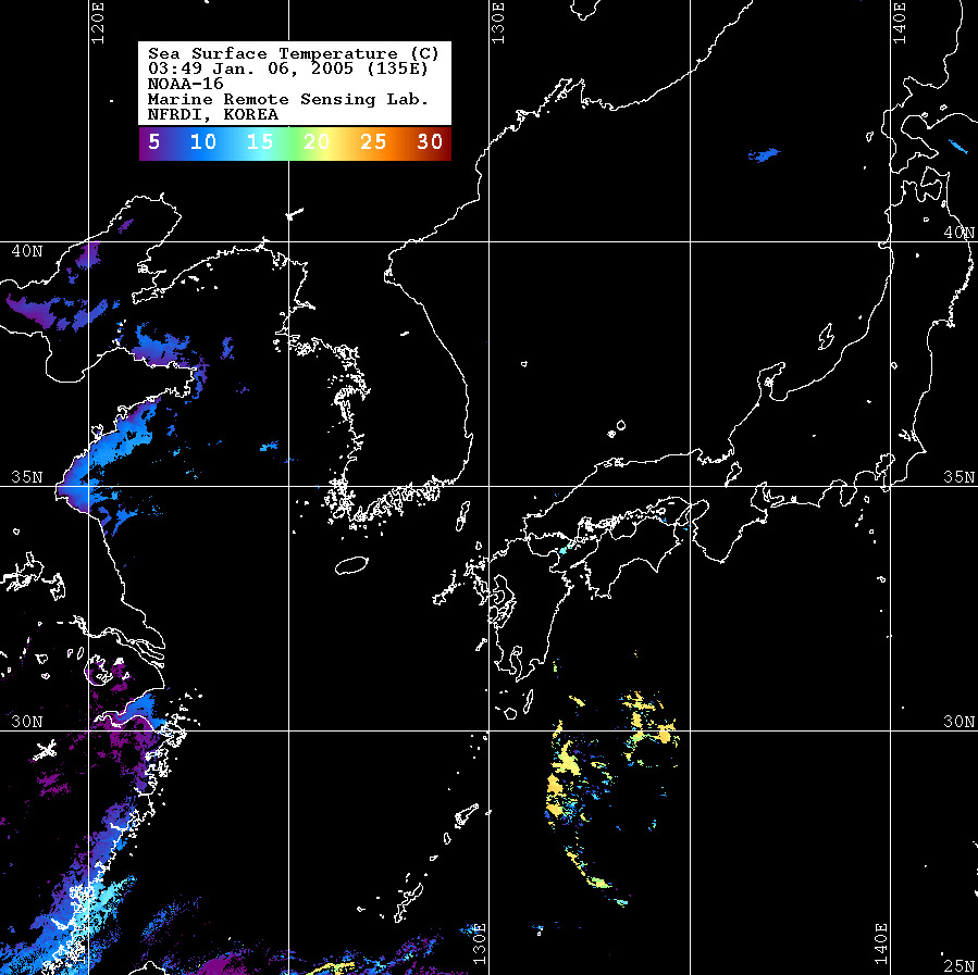 o 2005년 01월 06일 03시 49분 NOAA-16호 위성영상입니다. o 수온분포는 범례를 참고하시기 바랍니다. o 검은색은 구름 또는 육지를 나타냅니다.