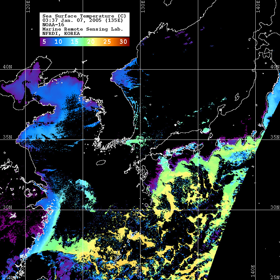 o 2005년 01월 07일 03시 37분 NOAA-16호 위성영상입니다. o 수온분포는 범례를 참고하시기 바랍니다. o 검은색은 구름 또는 육지를 나타냅니다.