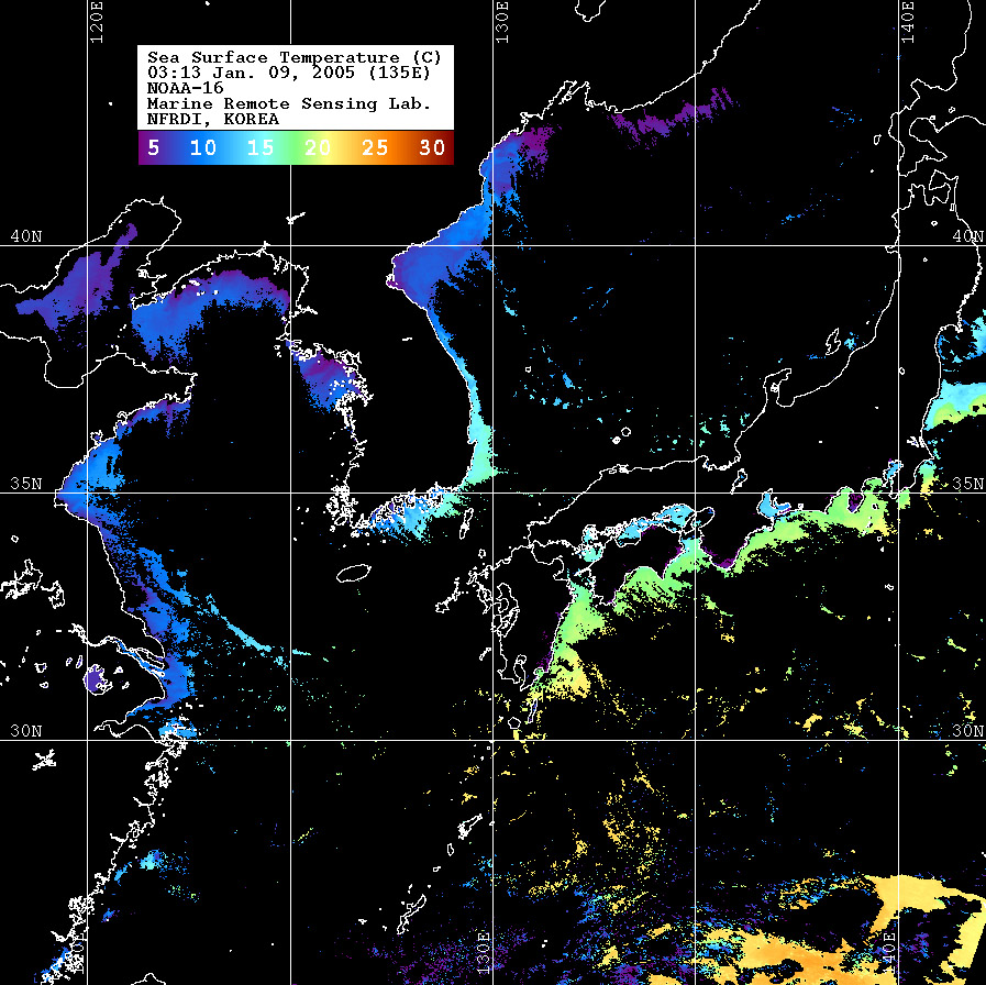 o 2005년 01월 09일 03시 13분 NOAA-16호 위성영상입니다. o 수온분포는 범례를 참고하시기 바랍니다. o 검은색은 구름 또는 육지를 나타냅니다.