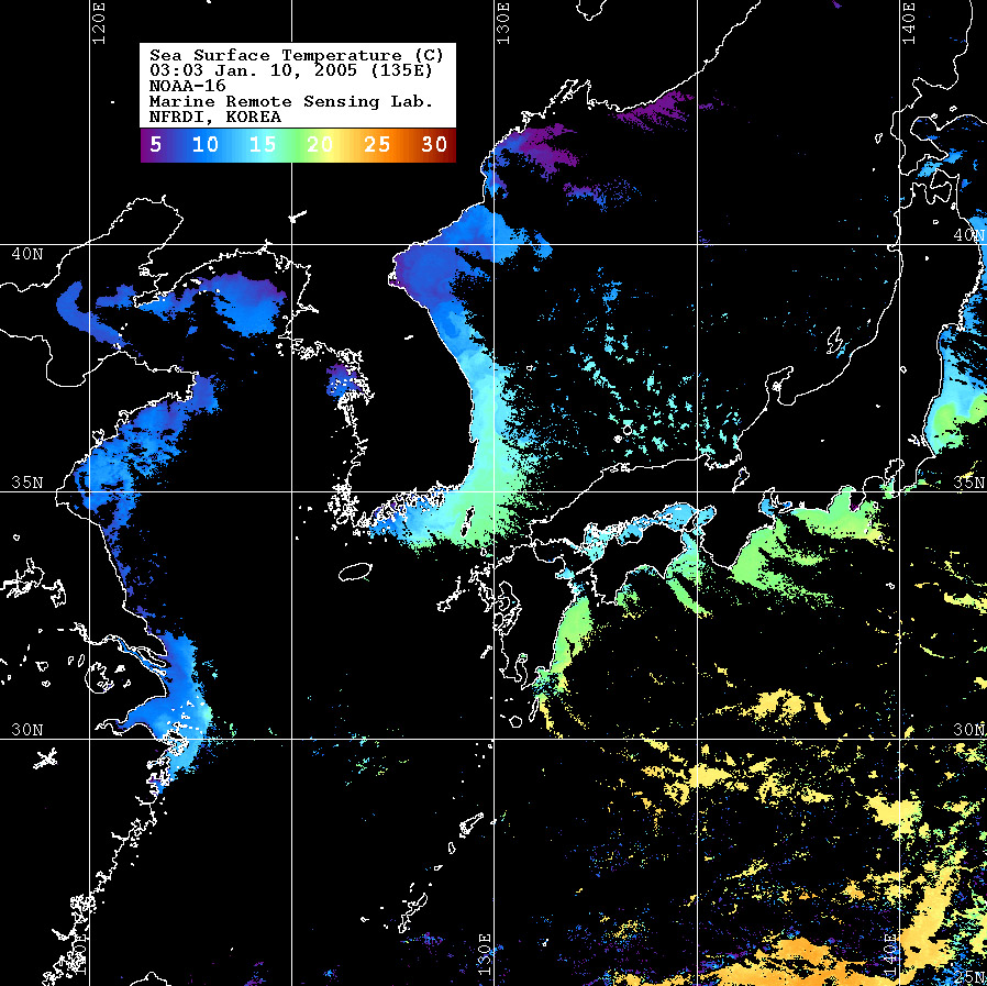 o 2005년 01월 10일 03시 03분 NOAA-16호 위성영상입니다. o 수온분포는 범례를 참고하시기 바랍니다. o 검은색은 구름 또는 육지를 나타냅니다.