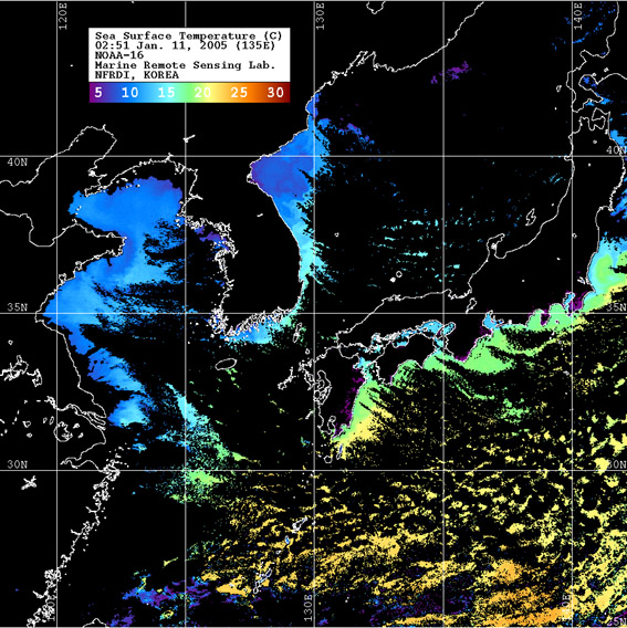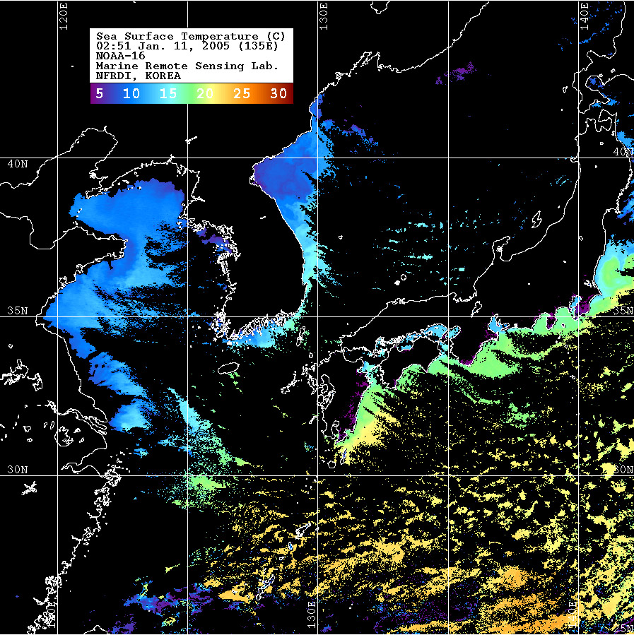 o 2005년 01월 11일 02시 51분 NOAA-16호 위성영상입니다. o 수온분포는 범례를 참고하시기 바랍니다. o 검은색은 구름 또는 육지를 나타냅니다.