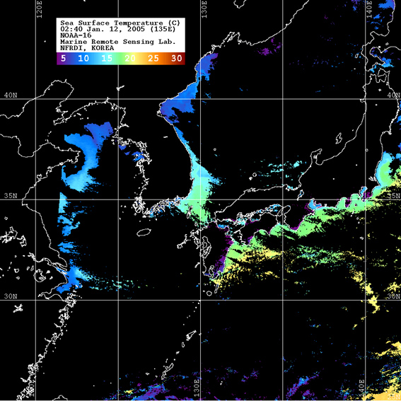 o 2005년 01월 12일 02시 40분 NOAA-16호 위성영상입니다. o 수온분포는 범례를 참고하시기 바랍니다. o 검은색은 구름 또는 육지를 나타냅니다.