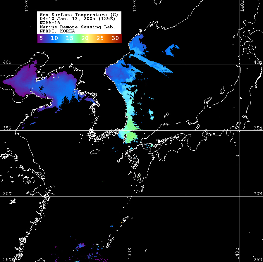 o 2005년 01월 13일 04시 10분 NOAA-16호 위성영상입니다. o 수온분포는 범례를 참고하시기 바랍니다. o 검은색은 구름 또는 육지를 나타냅니다.