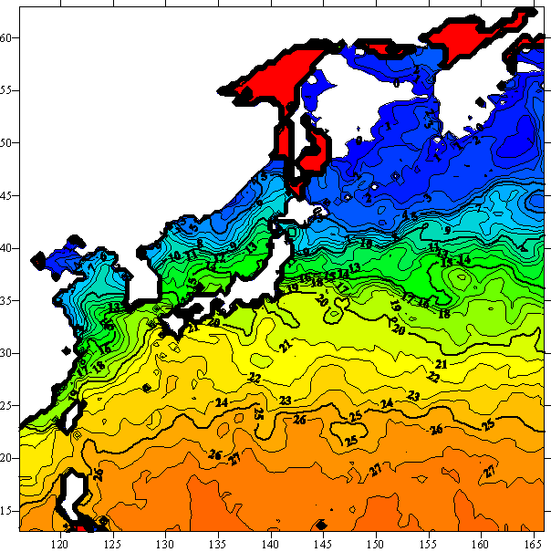 o 2005년 1월 13일 북서태평양 광역해양 수온분포 입니다.