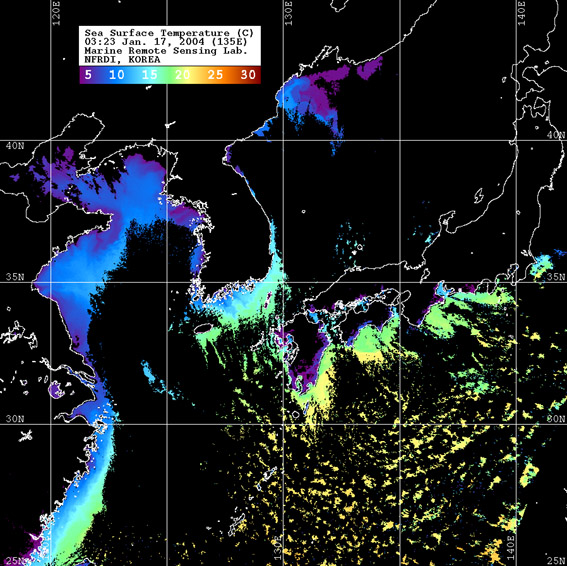 o 2005년 01월 17일 03시 23분 NOAA-16호 위성영상입니다. o 수온분포는 범례를 참고하시기 바랍니다. o 검은색은 구름 또는 육지를 나타냅니다.