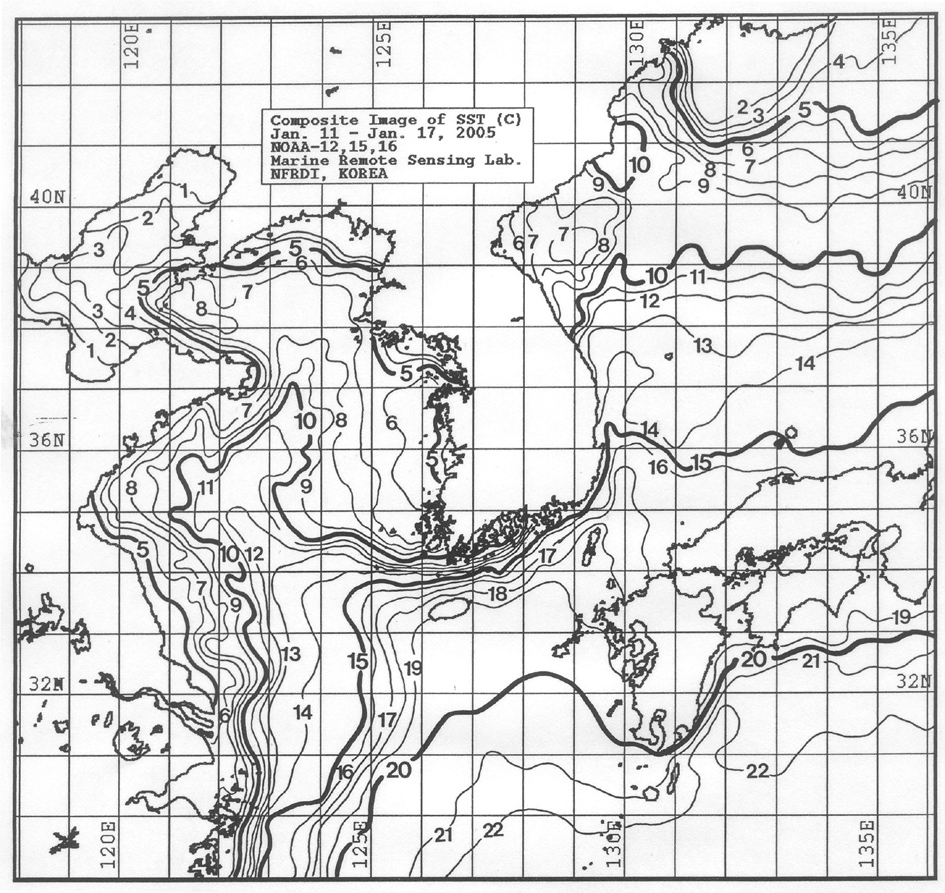 o 금주 (2005.01.11~01.17)의 한국근해 표면수온은 대화퇴 근해 섭씨 9~10도, 울릉도 근해 13~14도, 대마도 근해 18~19도, 제주도 근해 18~20도, 이어도 근해 15~17도, 일향초 근해 13~15도, 어청도 근해 5~6도 내외로 나타납니다. o 「평년에 비해」수온은 대화퇴 근해 비슷하게, 울릉도 근해 0.5도 높게, 대마도 근해 2도 높게, 제주도 근해 및 이어도 근해 3도 높게, 일향초 근해 2도 높게, 어청도 근해 2도 낮게 나타납니다. o 수온 전선대는 이어도~제주해협~대한해협 서수도 에서 수온 16도를 중심으로 형성될 것으로 나타납니다. < 위의 그림을 클릭하시면 확대된 수온정보를 보실 수 있습니다 >