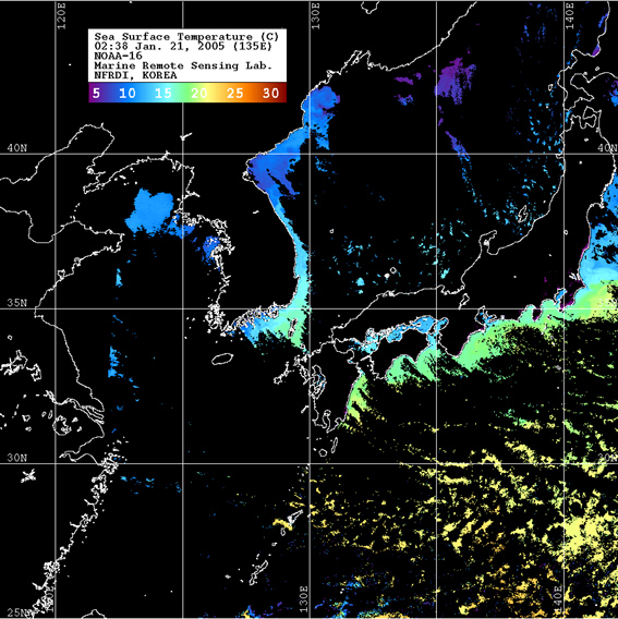 o 2005년 01월 21일 02시 38분 NOAA-16호 위성영상입니다. o 수온분포는 범례를 참고하시기 바랍니다. o 검은색은 구름 또는 육지를 나타냅니다.