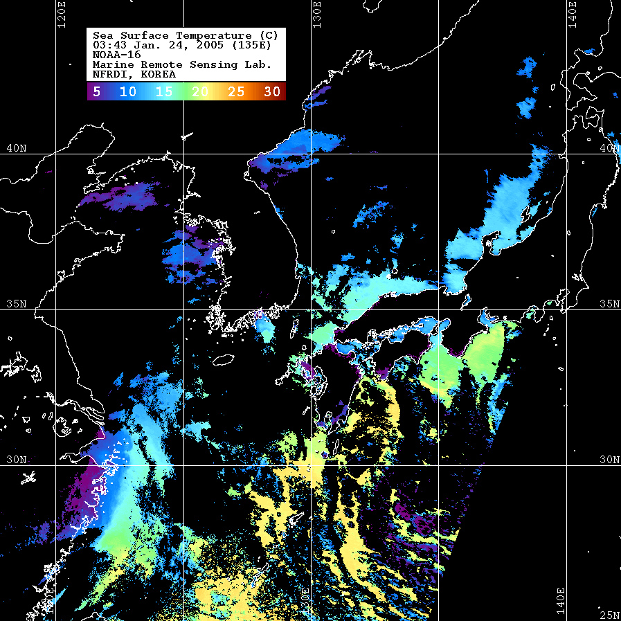 o 2005년 01월 24일 03시 43분 NOAA-16호 위성영상입니다. o 수온분포는 범례를 참고하시기 바랍니다. o 검은색은 구름 또는 육지를 나타냅니다.