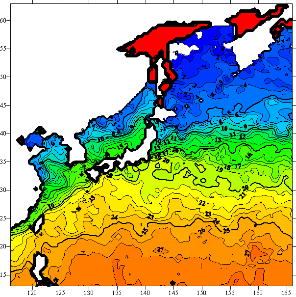 o 2005년 1월 22일 북서태평양 광역해양 수온분포 입니다.