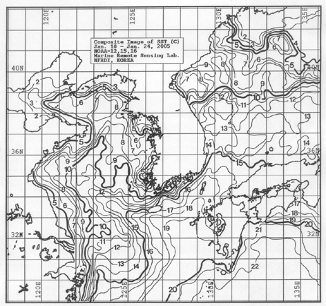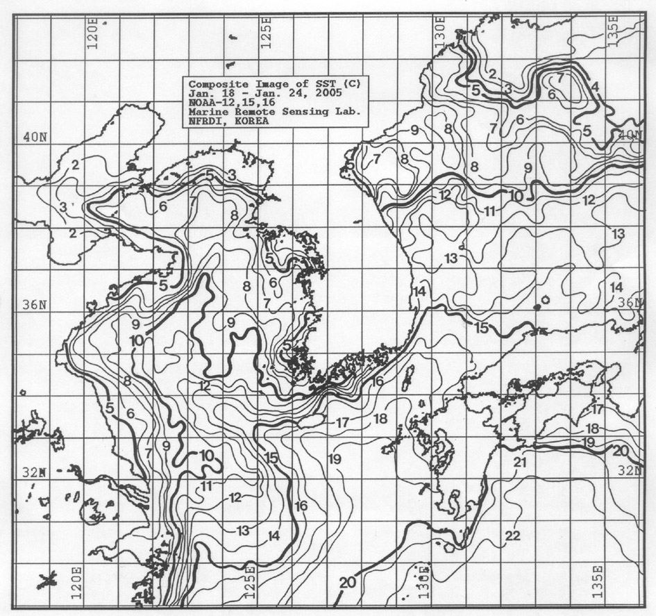 o 금주 (2005.01.18∼01.24)의 한국근해 표면수온은 대화퇴 근해 섭씨 7∼8도, 울릉도 근해 11∼12도, 대마도 근해 16∼17도, 제주도 근해 15∼17도, 이어도 근해 12∼14도, 일향초 근해 11∼13도, 어청도 근해 5∼6도 내외로 나타납니다. o 「평년에 비해」수온은 대화퇴 근해 1도 낮게, 울릉도 근해 비슷하게, 대마도 근해 1도 높게, 제주도 근해 및 이어도 근해 1도 높게, 일향초 근해 1도 높게, 어청도 근해 비슷하게 나타납니다. o 수온 전선대는 이어도∼제주해협∼대한해협 서수도 에서 수온 15도를 중심으로 형성될 것으로 나타납니다. < 위의 그림을 클릭하시면 확대된 수온정보를 보실 수 있습니다 >
