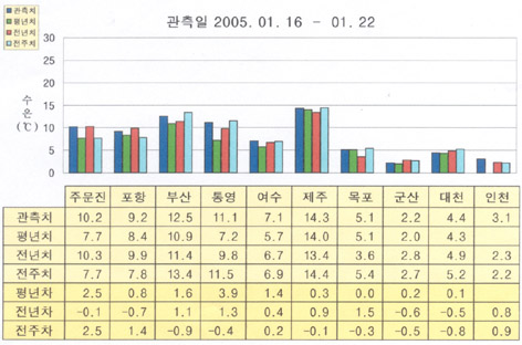 o 금주(2005.01.09∼01.15)의 한반도 연안 표면수온은 동해 연안역에서 섭씨 9∼10도, 남해 연안역에서 7∼14도, 서해 연안역에서 3∼5도 내외로 나타납니다.
