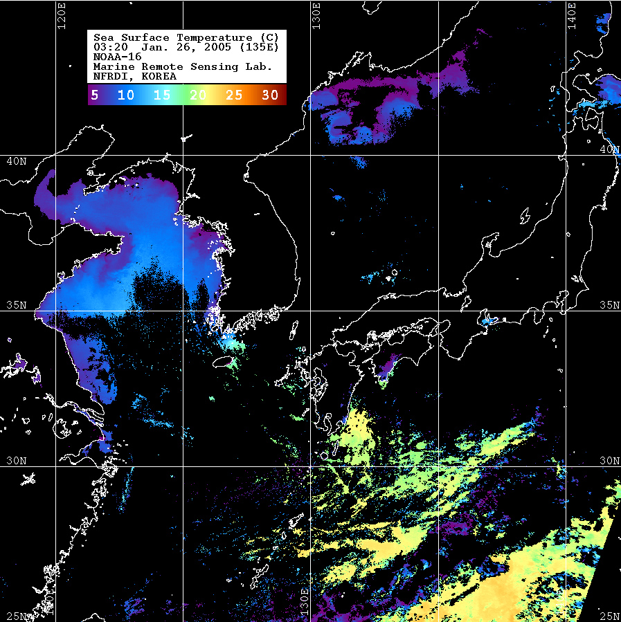 o 2005년 01월 26일 03시 20분 NOAA-16호 위성영상입니다. o 수온분포는 범례를 참고하시기 바랍니다. o 검은색은 구름 또는 육지를 나타냅니다.