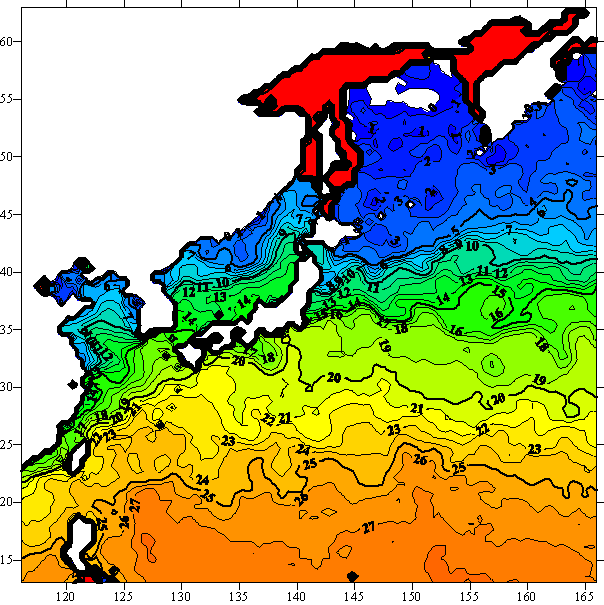 o 2005년 1월 25일 북서태평양 광역해양 수온분포 입니다.