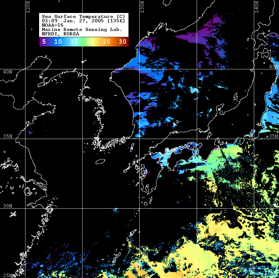 o 2005년 01월 27일 03시 09분 NOAA-16호 위성영상입니다. o 수온분포는 범례를 참고하시기 바랍니다. o 검은색은 구름 또는 육지를 나타냅니다.
