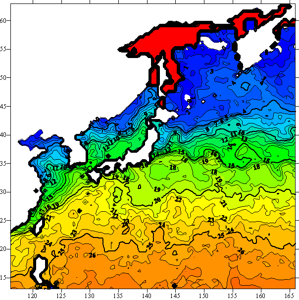 o 2005년 1월 27일 북서태평양 광역해양 수온분포 입니다.