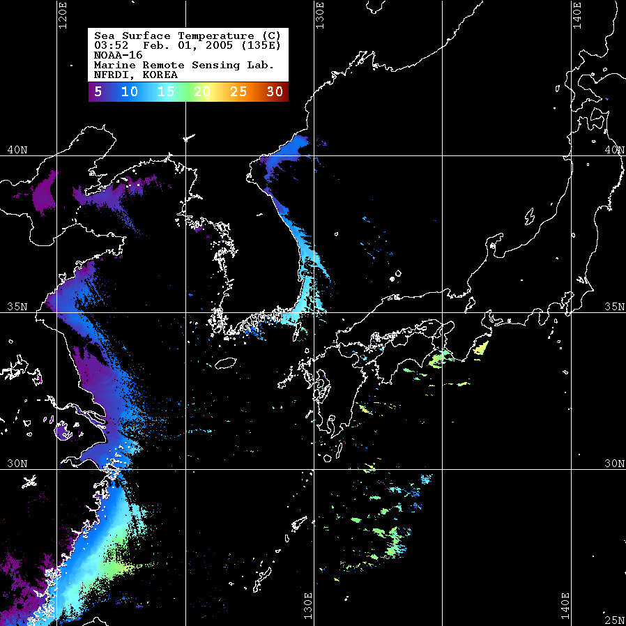o 2005년 02월 01일 03시 52분 NOAA-16호 위성영상입니다. o 수온분포는 범례를 참고하시기 바랍니다. o 검은색은 구름 또는 육지를 나타냅니다.