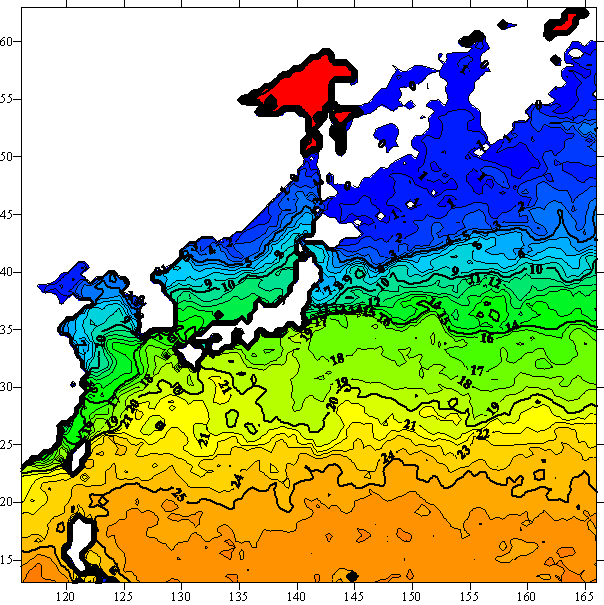 o 2005년 2월 1일 북서태평양 광역해양 수온분포 입니다.