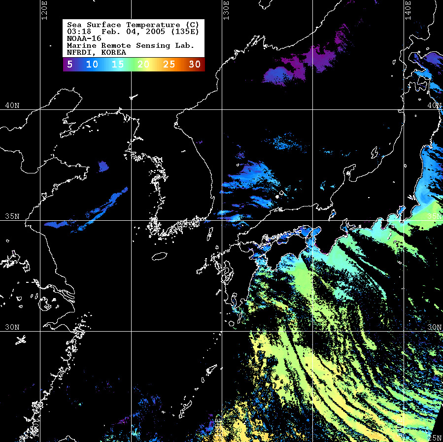 o 2005년 02월 04일 03시 18분 NOAA-16호 위성영상입니다. o 수온분포는 범례를 참고하시기 바랍니다. o 검은색은 구름 또는 육지를 나타냅니다.