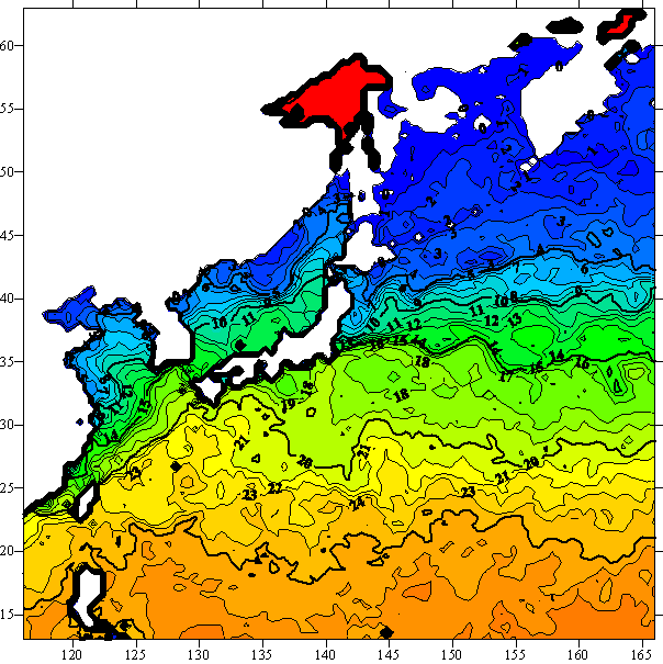 o 2005년 2월 3일 북서태평양 광역해양 수온분포 입니다.
