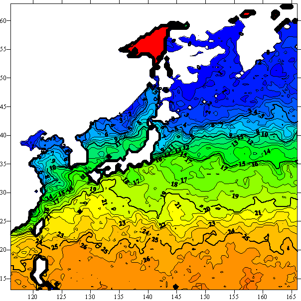 o 2005년 2월 5일 북서태평양 광역해양 수온분포 입니다.