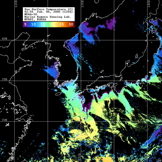 o 2005년 02월 06일 02시 55분 NOAA-16호 위성영상입니다. o 수온분포는 범례를 참고하시기 바랍니다. o 검은색은 구름 또는 육지를 나타냅니다.