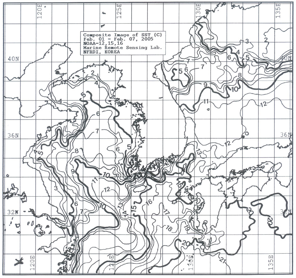 o 금주 (2005.02.01∼02.07)의 한국근해 표면수온은 대화퇴 근해 섭씨 6∼8도, 울릉도 근해 10∼12도, 대마도 근해 14∼15도, 제주도 근해 14∼15도, 이어도 근해 9∼11도, 일향초 근해 9∼10도, 어청도 근해 4∼6도 내외로 나타납니다.