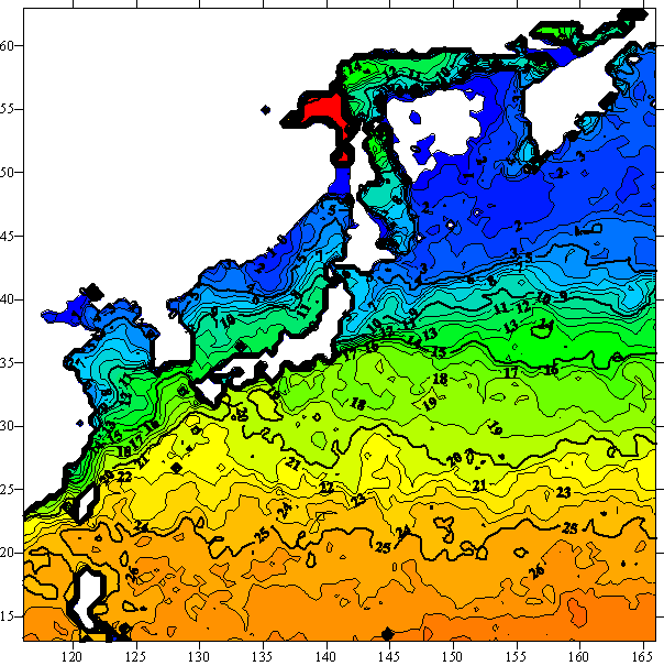 o 2005년 2월 7일 북서태평양 광역해양 수온분포 입니다.