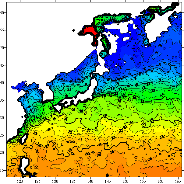 o 2005년 2월 8일 북서태평양 광역해양 수온분포 입니다.