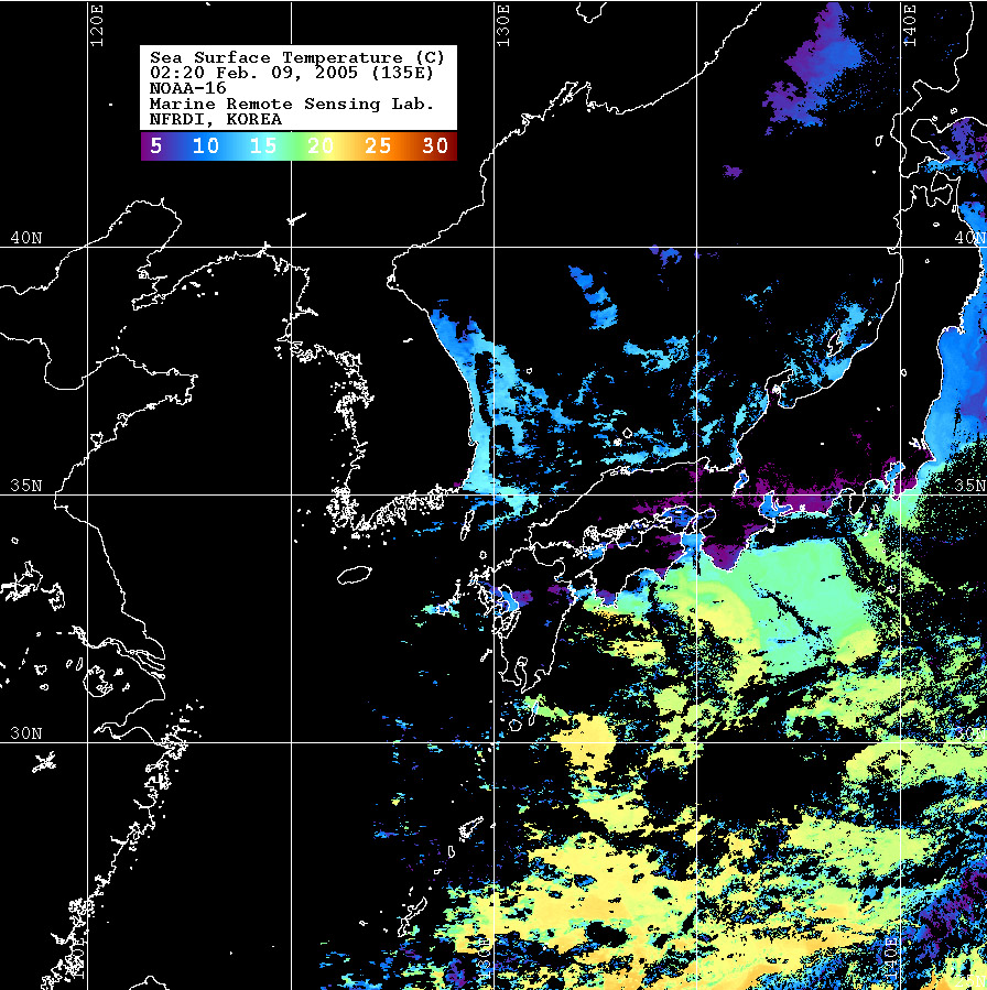 o 2005년 02월 09일 02시 20분 NOAA-16호 위성영상입니다. o 수온분포는 범례를 참고하시기 바랍니다. o 검은색은 구름 또는 육지를 나타냅니다.