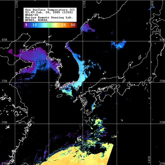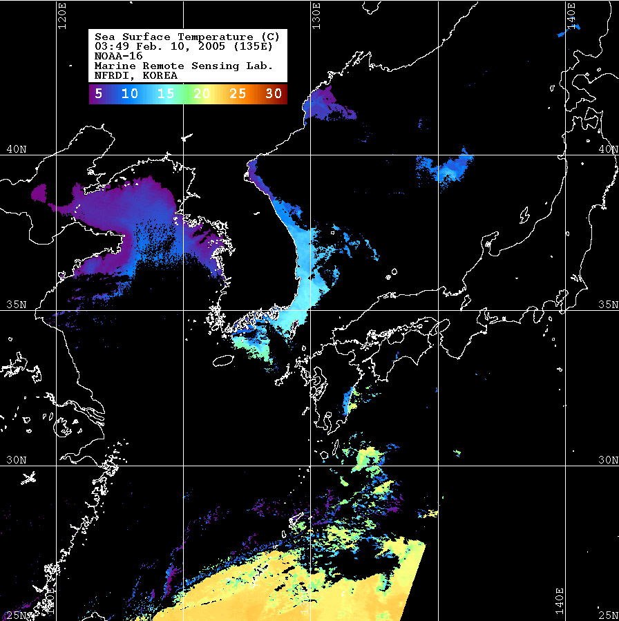o 2005년 02월 10일 03시 49분 NOAA-16호 위성영상입니다. o 수온분포는 범례를 참고하시기 바랍니다. o 검은색은 구름 또는 육지를 나타냅니다.