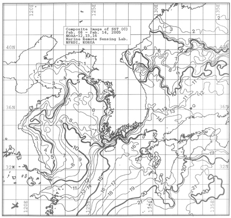 o 금주 (2005.02.08∼02.14)의 한국근해 표면수온은 대화퇴 근해 섭씨 5∼7도, 울릉도 근해 9∼11도, 대마도 근해 14∼16도, 제주도 근해 14∼16도, 이어도 근해 11∼13도, 일향초 근해 9∼10도, 어청도 근해 5∼6도 내외로 나타납니다.
