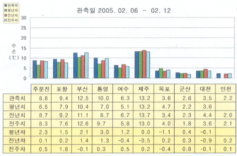 o 금주(2005.02.06∼02.12)의 한반도 연안 표면수온은 동해 연안역에서 섭씨 9∼9.5도, 남해 연안역에서 6.5∼13도, 서해 연안역에서 2∼3.5도 내외로 나타납니다.