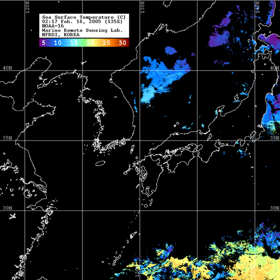 o 2005년 02월 18일 02시 17분 NOAA-16호 위성영상입니다. o 수온분포는 범례를 참고하시기 바랍니다. o 검은색은 구름 또는 육지를 나타냅니다.