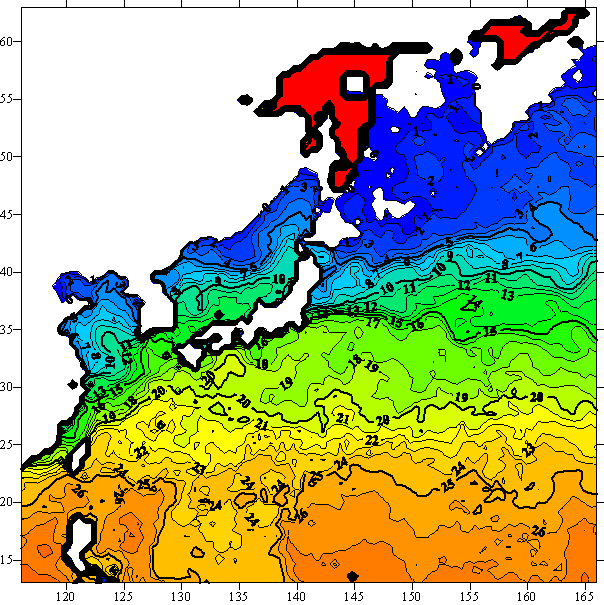 o 2005년 2월 17일 북서태평양 광역해양 수온분포 입니다.