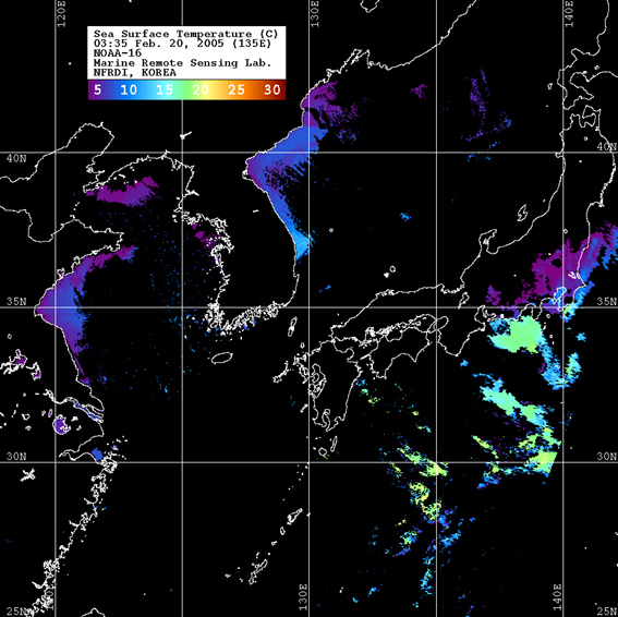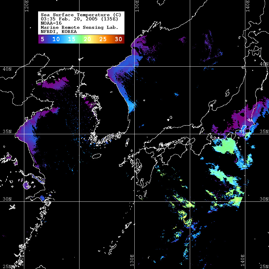 o 2005년 02월 20일 03시 35분 NOAA-16호 위성영상입니다. o 수온분포는 범례를 참고하시기 바랍니다. o 검은색은 구름 또는 육지를 나타냅니다.