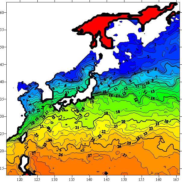 o 2005년 2월 23일 북서태평양 광역해양 수온분포 입니다.
