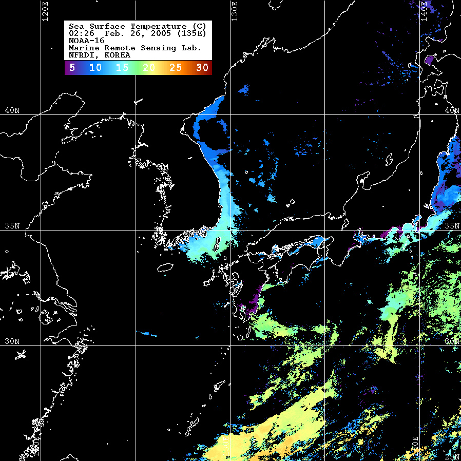 o 2005년 02월 26일 02시 26분 NOAA-16호 위성영상입니다. o 수온분포는 범례를 참고하시기 바랍니다. o 검은색은 구름 또는 육지를 나타냅니다.