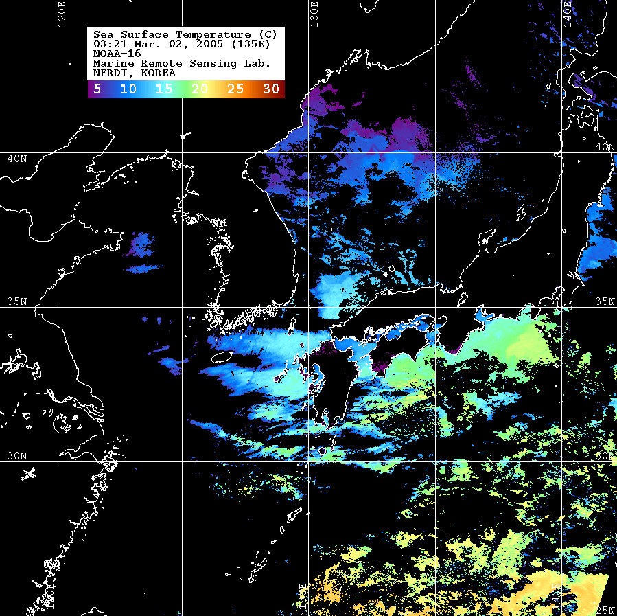 o 2005년 03월 02일 03시 21분 NOAA-16호 위성영상입니다. o 수온분포는 범례를 참고하시기 바랍니다. o 검은색은 구름 또는 육지를 나타냅니다.