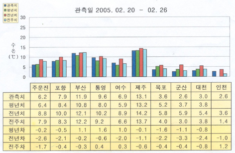 o 금주(2005.02.20∼02.26)의 한반도 연안 표면수온은 동해 연안역에서 섭씨 6∼8도, 남해 연안역에서 7∼13도, 서해 연안역에서 2.5∼3.5도 내외로 나타납니다.