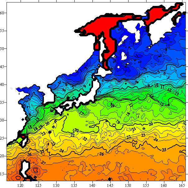 o 2005년 03월 01일 북서태평양 광역해양 수온분포 입니다.