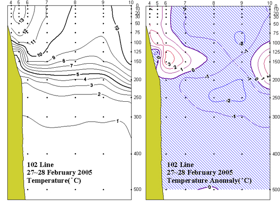 ◦ 2005년 2월 27~28일 국립수산과학원 동해수산연구소에서 조사한 102선(포항 동방)의 수직수온분포도 및 평년편차도 입니다.