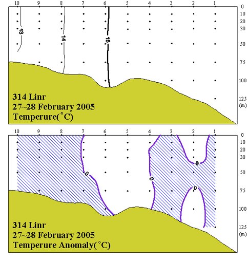 ◦ 2005년 2월 27~28일 국립수산과학원 남해수산연구소에서 조사한 314선(제주 남부해역)의 수직수온분포도 및 평년편차도 입니다.