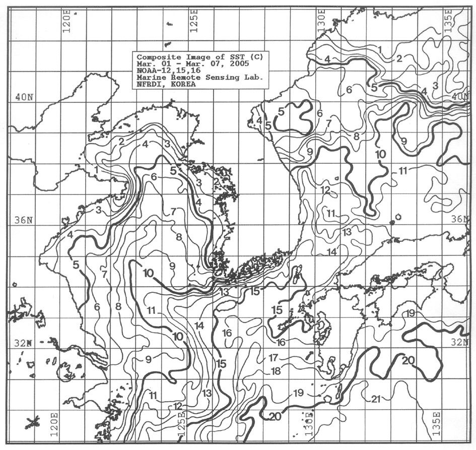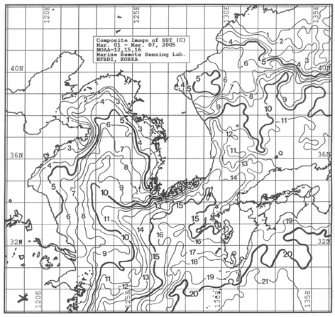 o 금주 (2005.03.01∼03.07)의 한국근해 표면수온은 대화퇴 근해 섭씨 7∼9도, 울릉도 근해 10∼11도, 대마도 근해 14∼15도, 제주도 근해 14∼16도, 이어도 근해 9∼11도, 일향초 근해 9∼11도, 어청도 근해 3∼5도 내외로 나타납니다.