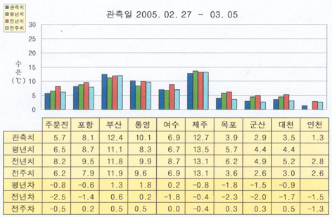 o 금주(2005.02.27∼03.05)의 한반도 연안 표면수온은 동해 연안역에서 섭씨 6∼8도, 남해 연안역에서 7∼13도, 서해 연안역에서 1.5∼4도 내외로 나타납니다.
