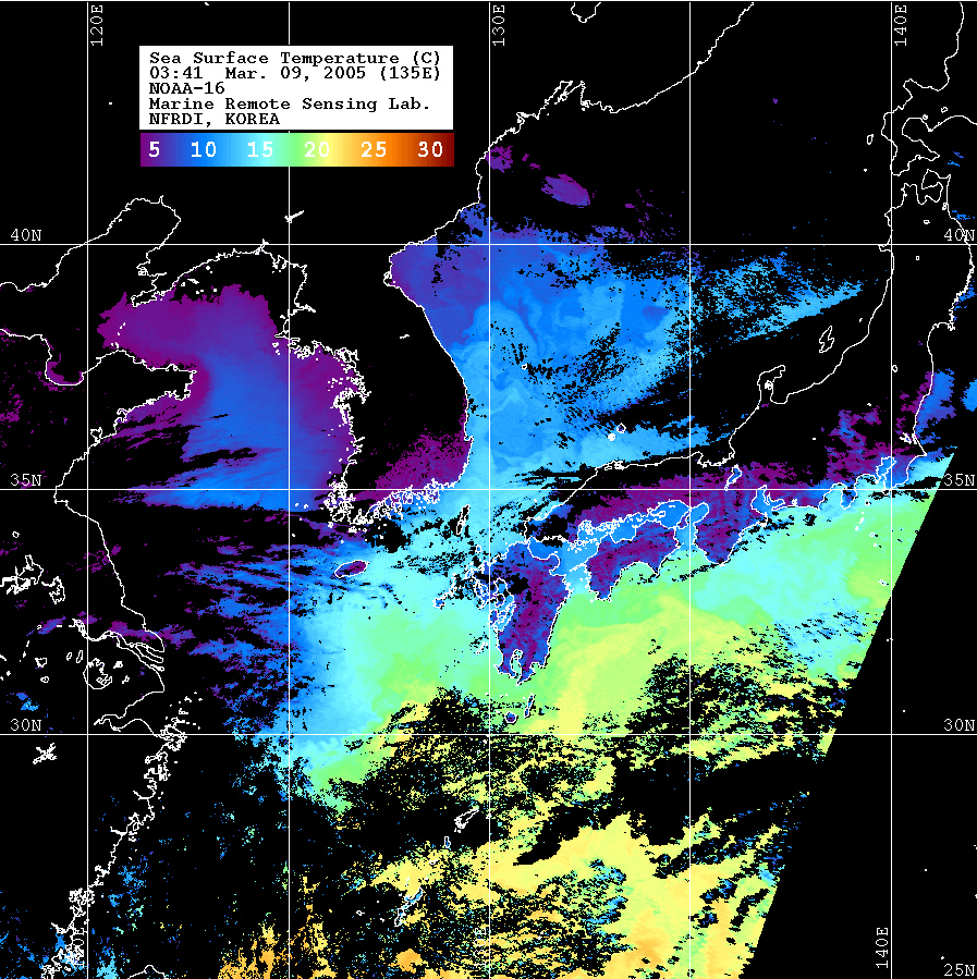 o 2005년 03월 09일 03시 41분 NOAA-16호 위성영상입니다. o 수온분포는 범례를 참고하시기 바랍니다. o 검은색은 구름 또는 육지를 나타냅니다.