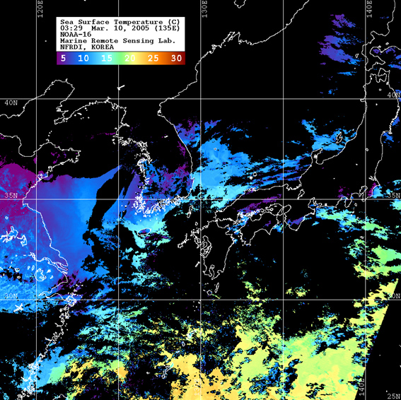 o 2005년 03월 10일 03시 29분 NOAA-16호 위성영상입니다. o 수온분포는 범례를 참고하시기 바랍니다. o 검은색은 구름 또는 육지를 나타냅니다.