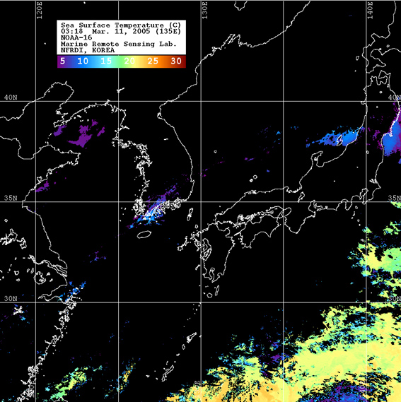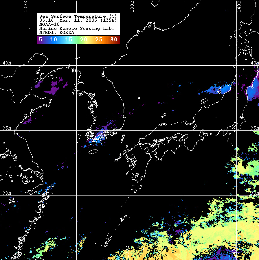 o 2005년 03월 11일 03시 18분 NOAA-16호 위성영상입니다. o 수온분포는 범례를 참고하시기 바랍니다. o 검은색은 구름 또는 육지를 나타냅니다.